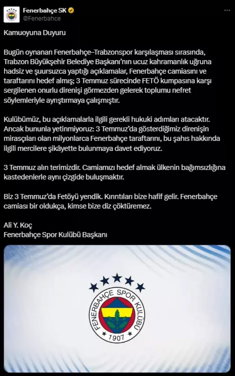 “Bugün ucuz kahramanlık uğruna yapılan hadsiz açıklamalar, Fenerbahçe camiasını hedef almıştır. 3 Temmuz’da FETÖ kumpasına karşı dimdik duran milyonları yok sayarak toplumu ayrıştırmaya çalışmak kabul edilemez. Kulübümüz bu sözlerle ilgili hukuki adımları atacaktır. Bununla yetinmiyor, milyonlarca Fenerbahçeliyi de bu şahıs hakkında suç duyurusunda bulunmaya davet ediyoruz.”