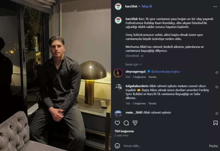 Bölgesel Amatör Lig ekiplerinden Kars 36 Spor’da forma giyen 20 yaşındaki Kubilay Kaan Kundakçı’dan bayram öncesi acı haber geldi. Genç futbolcu, tatil için bulunduğu İstanbul’da silahlı saldırıya uğrayarak yaşamını yitirdi.