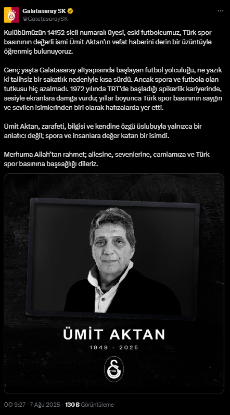 Galatasaray Spor Kulübü, Ümit Aktan’ın vefatı üzerine yayımladığı mesajda şu ifadelere yer verdi: