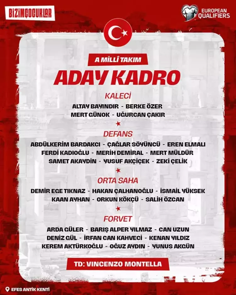 2026 Dünya Kupası yolculuğuna güçlü bir başlangıç yapmayı hedefleyen A Millî Takım, özellikle ev sahibi olduğu İspanya maçında taraftar desteğini arkasına alarak 3 puan hedefliyor. Aday kadroya ilişkin tüm detaylar aşağıda:
