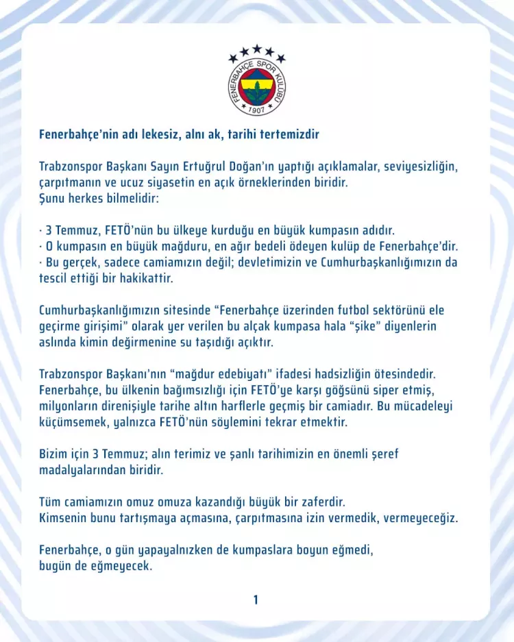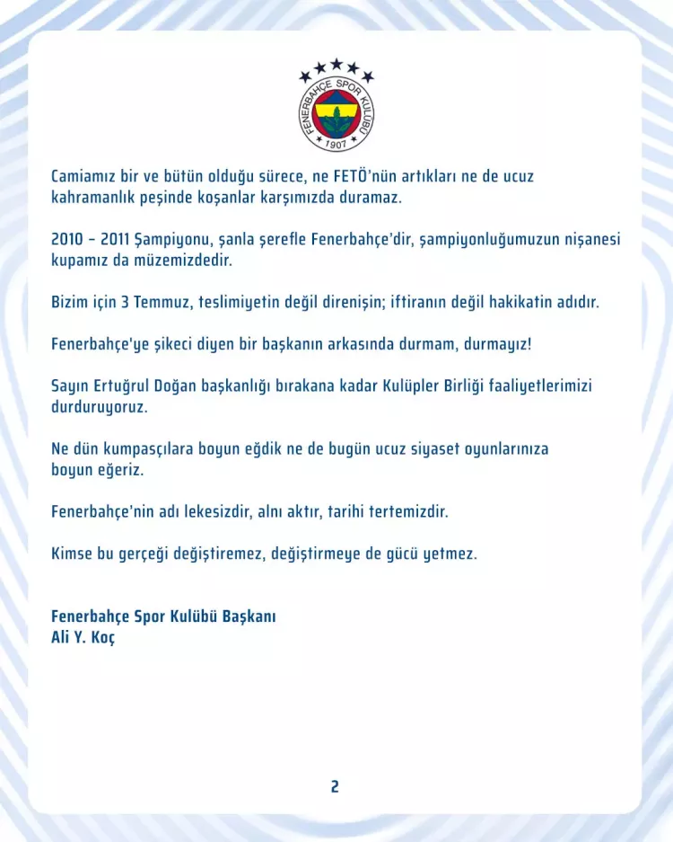 “Camiamız bir ve bütün olduğu sürece, ne FETÖ’nün artıkları ne de ucuz kahramanlık peşinde koşanlar karşımızda duramaz. 2010-2011 şampiyonu şanla şerefle Fenerbahçe’dir. Bizim için 3 Temmuz, teslimiyetin değil direnişin adıdır. Fenerbahçe’ye şikeci diyen bir başkanın arkasında durmayız. Ertuğrul Doğan başkanlığı bırakana kadar Kulüpler Birliği faaliyetlerimizi durduruyoruz.”