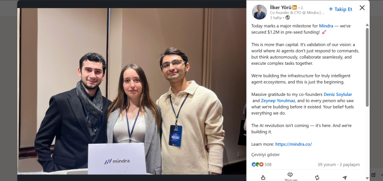 Yapay zekâ alanında Türkiye çıkışlı girişimler küresel yatırım sahnesinde daha görünür hâle gelirken, otonom yapay zekâ ajanları üzerine çalışan Mindra, tohum öncesi yatırım turunda ABD merkezli bir fondan 1,2 milyon dolar yatırım alarak önemli bir eşiği geride bıraktı. Girişimin hedefi, otonom çalışan yapay zekâ ekosistemleri için küresel ölçekte altyapı sağlayıcısı olmak.