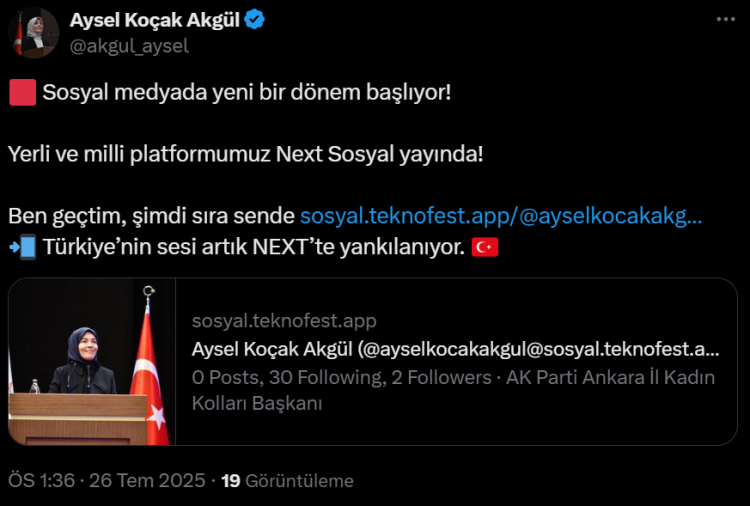 AK Parti Ankara İl Kadın Kolları Başkanı Aysel Koçak Akgül, X üzerinden yerli sosyal medya platformu NEXT Sosyal’in yayına başladığını duyurdu. "Sosyal medyada yeni bir dönem!" diyen Akgül, kullanıcıları yeni platforma davet ediyor.