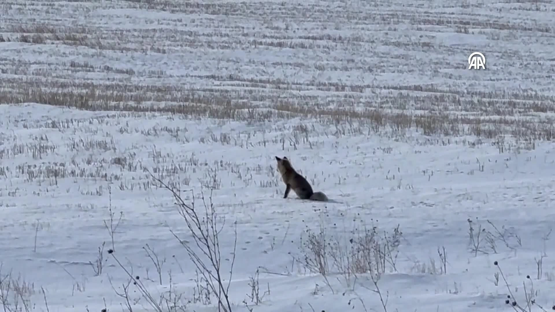 Ardahan-Artvin kara yolunun asfalt tesisleri mevkisinde aç kalan bir tilkinin karla kaplı alanda yem arayışı görüntülendi.