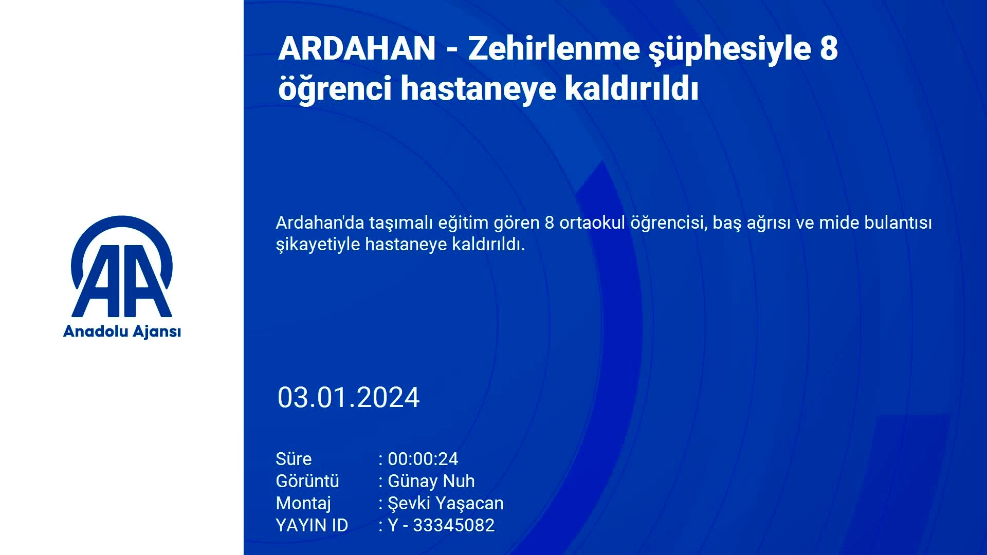 İl Milli Eğitim Müdür Vekili Atanur Sarıçam, Ardahan Devlet Hastanesi'nde tedavi gören öğrencileri ziyaretinde gazetecilere yaptığı açıklamada, merkeze bağlı Yukarıkurdoğlu Ortaokulu'ndaki 8 öğrencinin, baş ağrısı ve mide bulantısı şikayeti üzerine ambulanslarla hastaneye kaldırıldığını söyledi.
