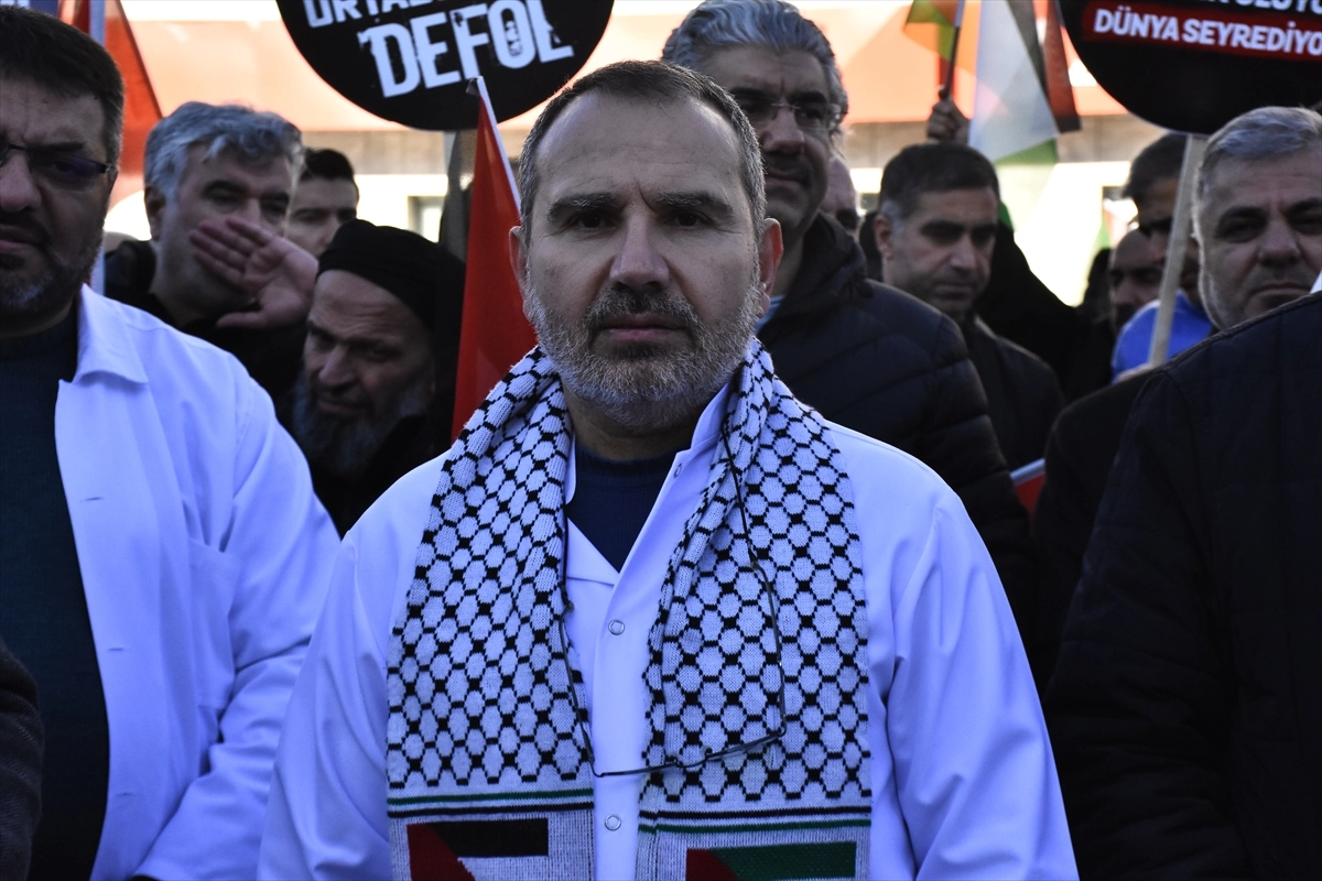 Beşyol Meydanı'nda bir araya gelen sağlık çalışanları, "Soykırıma hayır", Kudüs'e selam direnişe devam" ve "Siyonist İsrail, Filistin'den defol" yazılı dövizler taşıdı.