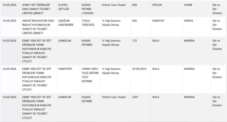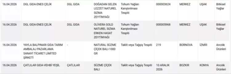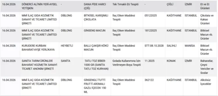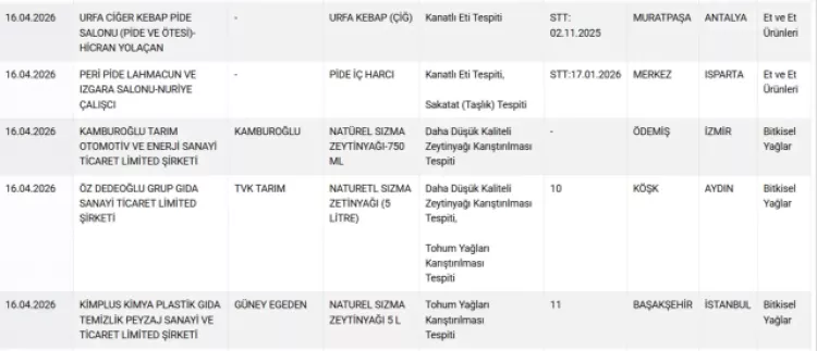 16 Nisan tarihli güncel listede yalnızca pide değil; bal, zeytinyağı, tereyağı, baharat, kebap, sucuk ve peynir ürünlerinde de farklı türde hileler tespit edildi. Bazı ürünlerde düşük kaliteli yağ karışımları, bazılarında ise etikette belirtilmeyen farklı et ve katkı maddeleri bulunduğu açıklandı.