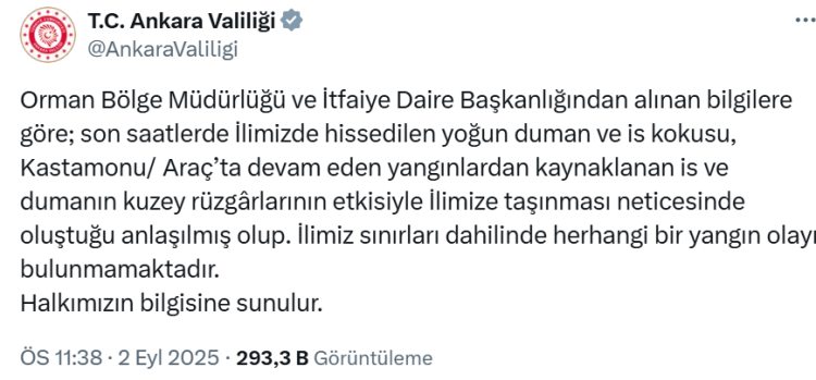 “Orman Bölge Müdürlüğü ve İtfaiye Daire Başkanlığından alınan bilgilere göre; ilimizde son saatlerde hissedilen yoğun duman ve is kokusu, Kastamonu/Araç’ta devam eden yangınlardan kaynaklanan is ve dumanın kuzey rüzgârlarının etkisiyle taşınması neticesinde oluşmuştur. İlimiz sınırları dahilinde herhangi bir yangın olayı bulunmamaktadır.”