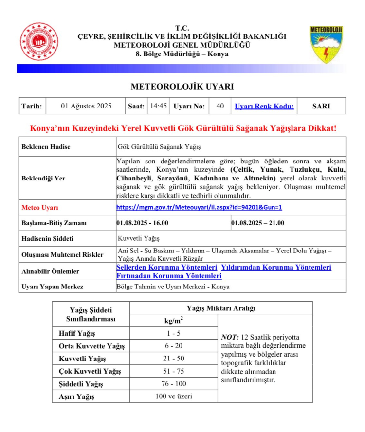 Meteoroloji Genel Müdürlüğü, Ankara ve Konya’nın bazı bölgeleri için “sarı” kodlu kuvvetli sağanak uyarısı yaptı. Özellikle öğleden sonra ve akşam saatlerinde etkili olması beklenen yağışın, yer yer gök gürültülü sağanak şeklinde olacağı belirtildi.