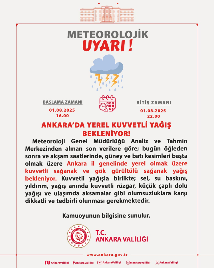 Açıklamada, güney ve batı kesimleri başta olmak üzere Ankara ile Konya'nın kuzeyinde lokal olarak kuvvetli yağış beklendiği vurgulandı. Yetkililer, vatandaşları sel, su baskını, yıldırım, ani rüzgar ve küçük çaplı dolu riski nedeniyle dikkatli olmaları konusunda uyardı.