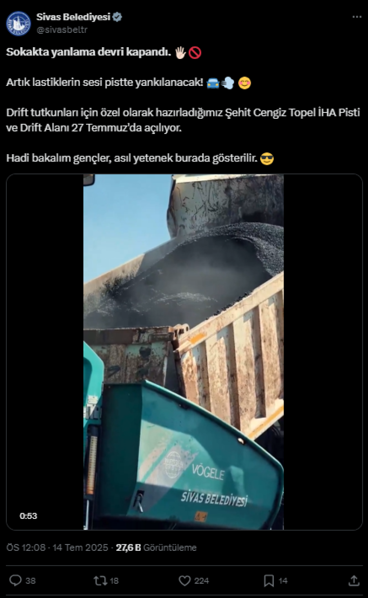 Sivas'ın eğitimci Belediye Başkanı Dr.Adem Uzun, şehrin kronikleşmiş sorunlarını bir bir çözerken drift tutkunu gençleri de unutmadı. Modern yapısı,konumu ve büyüklüğü ile Türkiye 'de ilk sırada gösterilen drift pistinin açılış haberi sadece Sivas değil tüm Türkiye'deki hız tutkunlarını heyecanlandırdı. Drift pistinin ilerleyen zamanlarda ulusal yarışmalara da ev sahipliği yapması bekleniyor. Dr.Adem Uzun X hesabından 'sokaklarda yanlama devri bitti ' diye duyurdu.
